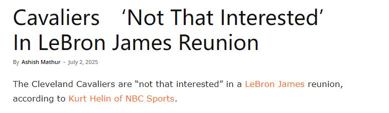 北京时间7月2日,据NBC体育记者库尔特-赫林报道,骑士队“对与勒布朗-詹姆斯重聚不太感兴趣”。