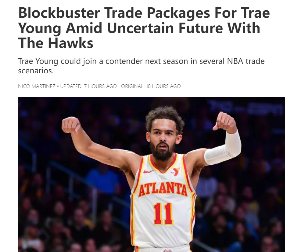 北京时间6月13日,美媒FW记者尼科-马丁内斯透露今夏特雷杨存在潜在的交易可能,他在亚特兰大已经待了7年,他帮助球队进入过一次东部决赛,可今年老鹰40胜42负明显已经出现巨大问题,26岁的特雷杨在前途未卜,他还剩两年9400万的合同。尼科-马丁内斯模拟了四套方案,这四套方案至多1个首轮签。