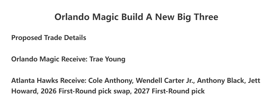 老鹰与魔术的交易方案,因为魔术太需要一个一号位,魔术送出科尔-安东尼、温德尔-卡特、安东尼-布莱克、杰特-火花队、2026年首轮互换权、2027年首轮签。